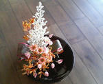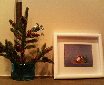母お手製の『つまみ絵』の横にクリスマスツリーに見立てた枝に飾りつけしてみました。