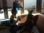 画像は図鑑を持ってきて本物のトマトの苗と見比べてるところ。